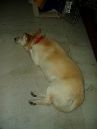 レモン、家の中を探検すること1時間半。今はパソコンをしている私の下で寝ています。
