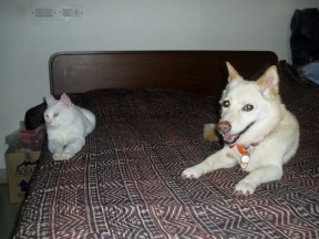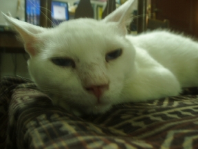 3mほど離れた所でその様子を見ていたレモンは、脚をかすめて走り去るブルーの行方を見てから、爪とぎをしていた箱のそばに寄り匂いをかぎました。
